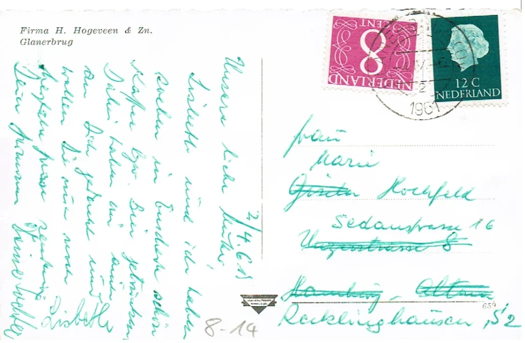 Nog geen postcode en geen internet en zodoende moest het vele dat men elkaar te vertellen had met kleine letters op een ansichtkaart, kosten 8 centen !